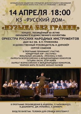 В этом году оркестру русских народных инструментов Детской школы искусств №2 им. В.П. Трифонова исполняется 60 лет. И мы решили: раз музыка не знает границ, то и наш концерт будет особенным — смелым, ярким и по-настоящему безграничным!