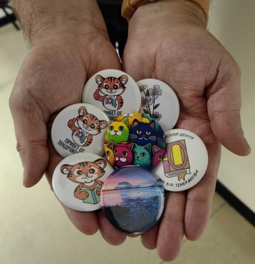 На мастер-классе вы можете сами сделать свой собственный значок, придумать надпись, нарисовать рисунок или выбрать уже готовое изображение у мастера, а следом на специальном станке закатать и забрать его на память!