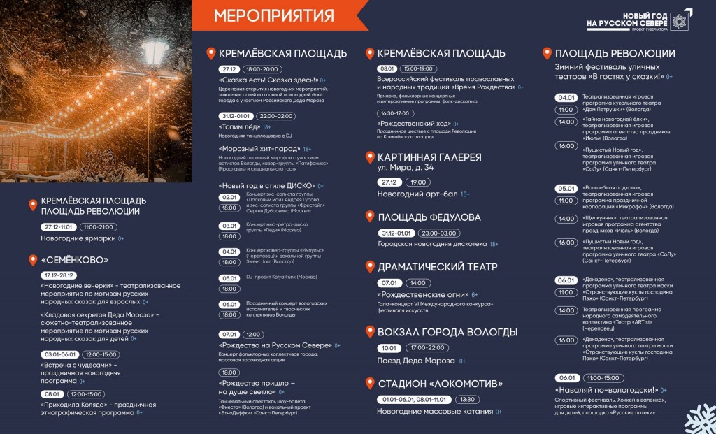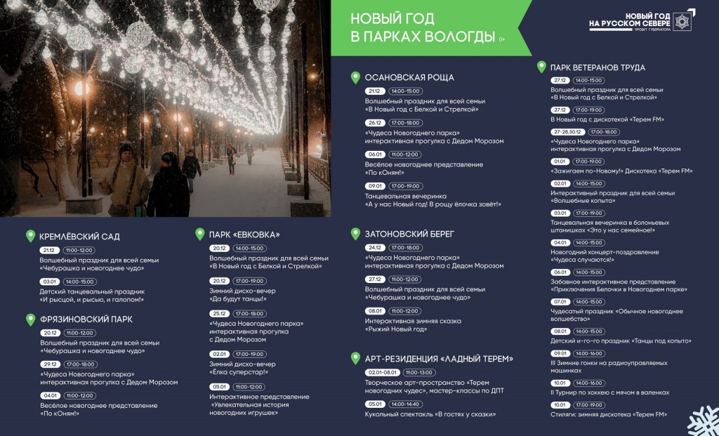 В преддверии праздников в Вологде подготовили масштабную афишу зимних мероприятий, которые пройдут с конца декабря на городских площадях, в парках и микрорайонах. Все события объединены в проект губернатора Георгия Филимонова «Зима Русского Севера», сообщает пресс-служба администрации города Вологды.