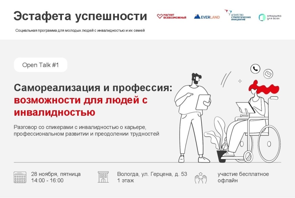 28 ноября 2025 года в городе Вологде состоится первое мероприятие на тему «Самореализация и профессия: возможности для людей с инвалидностью». Участников мероприятия ожидает встреча с людьми, которые, несмотря на ограничения, смогли реализоваться в профессии и найти своё место в жизни.