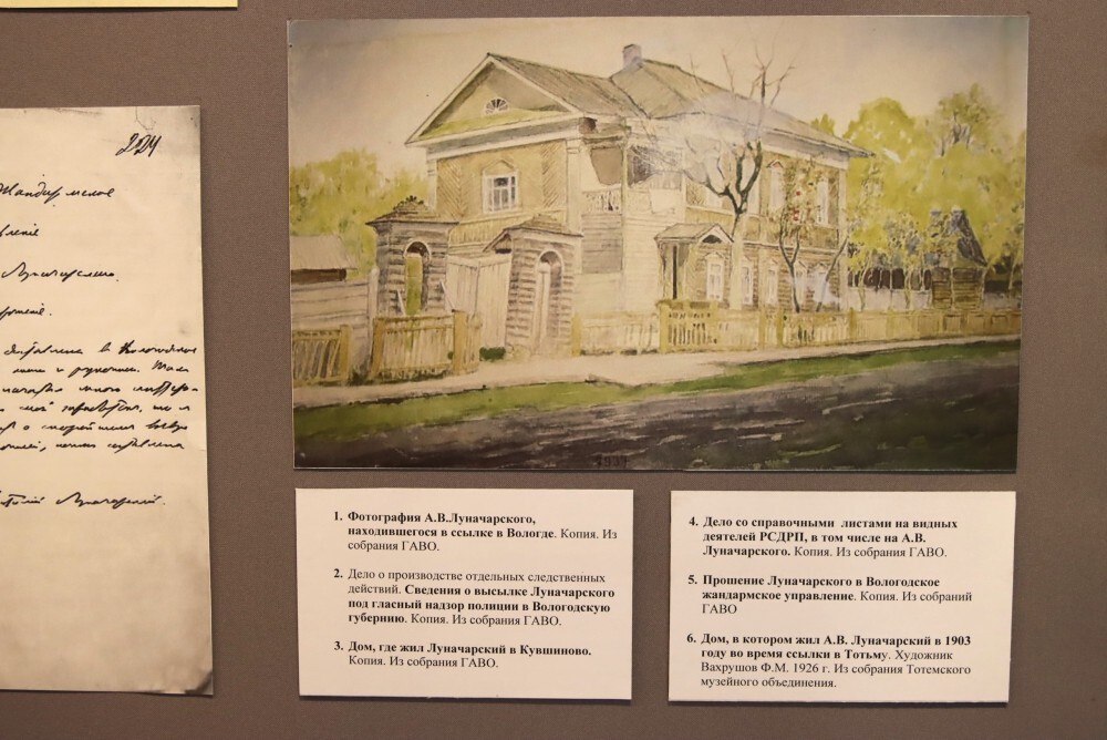 Выставка в музее «Вологодская ссылка» направлена на осмысление вологодского периода жизни первого наркома просвещения. Основу экспозиции составили документы и предметы из фондов Вологодского государственного музея-заповедника, Государственного архива Вологодской области, Тотемского музейного объединения.