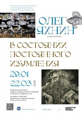 Выставка «В состоянии постоянного изумления» заслуженного художника России из Санкт-Петербурга Олега Юрьевича Яхнина, изначально планировалась как выставка графических работ и иллюстраций произведений Михаила Евграфовича Салтыкова-Щедрина выдающегося русского писателя, 200-летие со дня рождения которого мы празднуем буквально в дни конца января. Но в связи с тем, что это уже 4-я выставка произведений О. Ю. Яхнина в нашем городе и на всех предыдущих показывалась только его печатная графика, было решено расширить диапазон показа творчества этого замечательного художника, который творит не только в печатной графике, но и создает очень интересные, многоплановые с глубоким смыслом произведения в живописи и оригинальной графике. Тем более, что есть такой замечательный повод – в прошлом году Олегу Яхнину исполнилось 80 лет, а в этом году можно отмечать 60-летие его творческого пути после окончания Владивостокского художественного училища.