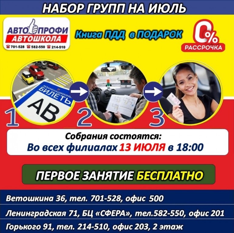 Автошкола «Авто-Профи» объявляет набор обучающихся на июль. Успевайте записаться и воспользоваться возможностью получить водительское удостоверение по сниженной цене.