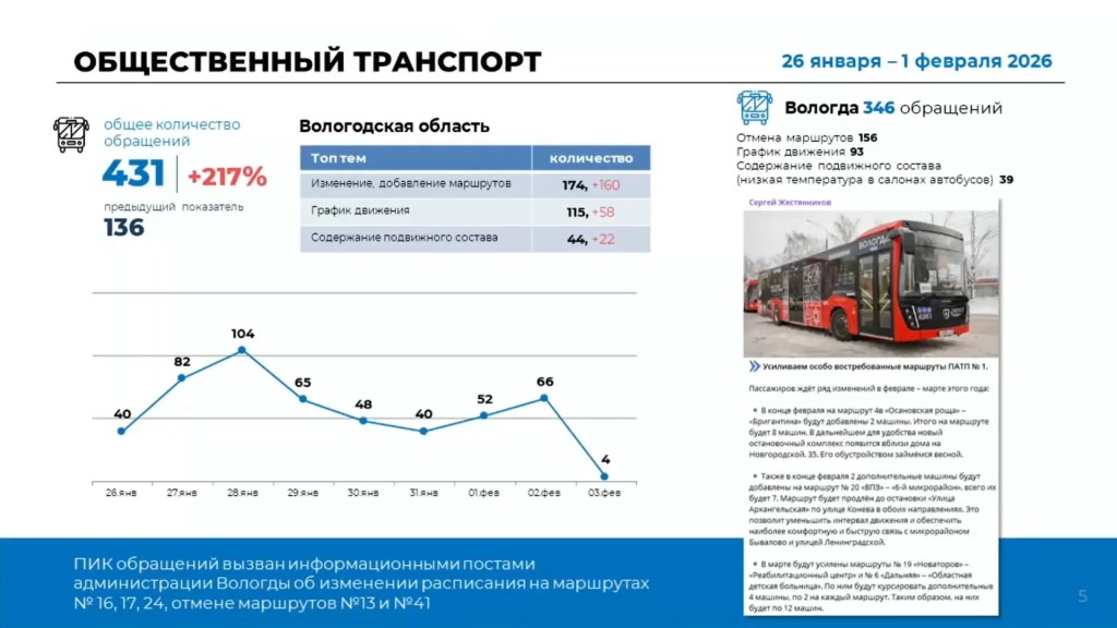 Большинство обращений было по городу Вологде. Так, в топе тем по Вологде – отмена маршрутов: 156 обращений; график движения – 93; содержание подвижного состава (низкая температура в салонах автобусов) – 39.