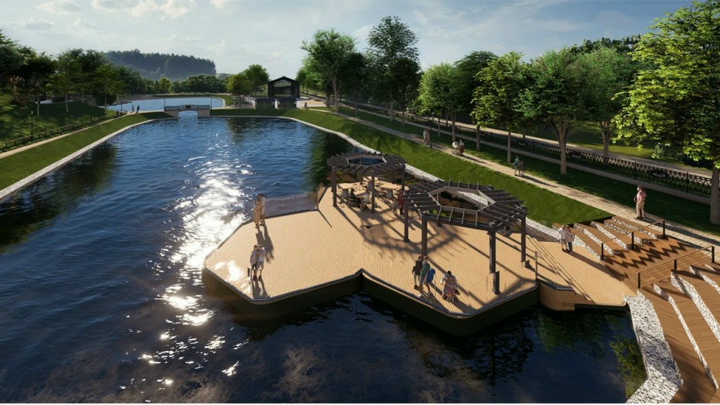 Особое внимание уделят зоне искусственных прудов: здесь очистят акваторию, укрепят и озеленят откосы, а также выполнят берегоукрепление с помощью габионов. Это поможет предотвратить осыпание прибрежных зон и сберечь важный участок территории. Концепцией предусмотрены два яруса откосов: нижний — бетонный, верхний — с озеленением и газоном. У прудов разместят малые архитектурные формы и пирс для катамаранов. Рядом обустроят зону отдыха на холме с беседкой и лестницей‑амфитеатром для небольших концертов. Кроме того, вдоль дорожек и у пруда организуют локальные места отдыха и установят шесть нестационарных торговых точек в едином стиле с новыми МАФами.