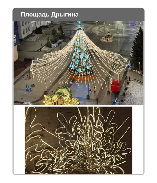 Площадь Дрыгина встретит горожан эффектной входной группой с цифрами «2026» и нарядной елкой с шатром. На бульваре проспекта Победы гостей будут приветствовать световой фонтан, арка «Олени» и деревья, окутанные мерцающими гирляндами.