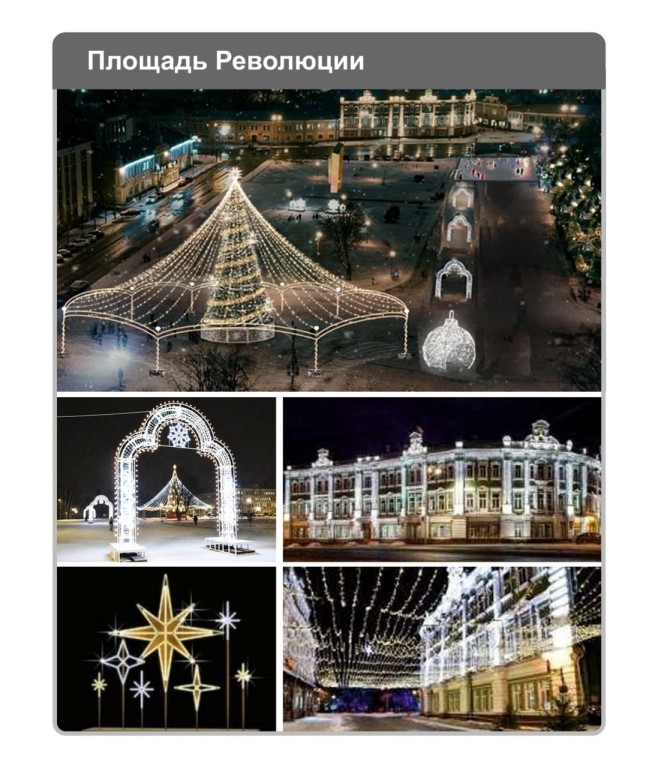 Возле ЦУМа разместятся праздничные композиции с декоративными звездами, фонарями и елочками. Пушкинская аллея заиграет новыми красками благодаря 14 световым полупорталам, создающим эффект торжественного коридора.