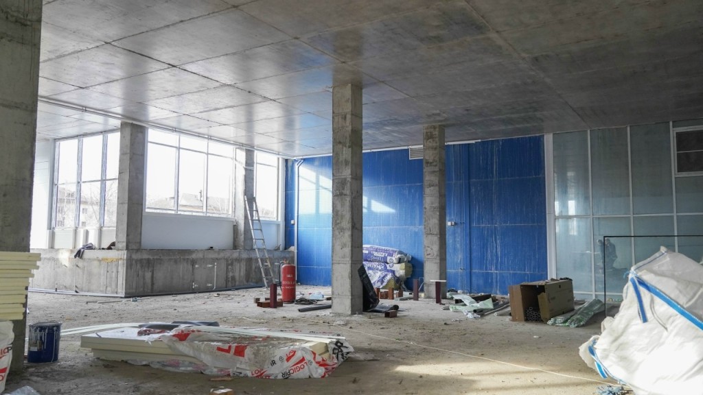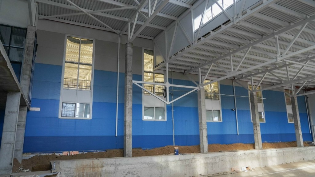Строительство началось в прошлом году, и за это время строители добились существенных результатов: возведен каркас здания, завершена облицовка фасада, залита чаша бассейна. В ближайших планах — выполнить электромонтаж и установить витражное остекление. После этого подрядчики перейдут к монтажу системы вентиляции и внутренней отделке помещений.