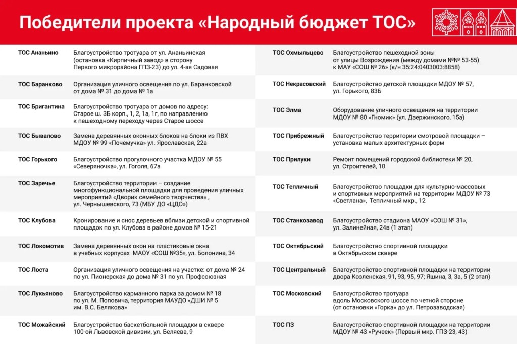 «По правилам программы, для того чтобы проект получил финансирование, за него должны проголосовать не менее 15% жителей, проживающих на территории конкретного ТОСа. В этом году из 33 ТОСов необходимый порог преодолели 22 территориальных общественных самоуправления: Ананьино, Бригантина, Баранково, Лоста, Можайский, Октябрьский, Центральный, Охмыльцево, Прибрежный, Бывалово, Элма, Локомотив, Горького, Некрасовский, ПЗ, Тепличный, Станкозавод, Прилуки, Лукьяново, Заречье и Клубова. Вместе с ТОС «Московский», который был перенесен с прошлого года, реализуем проекты-победителей в 2026 году. После обработки всех протоколов и проведения оргкомитета будут подведены окончательные итоги», – рассказала директор Центра по работе с населением города Вологды Елена Громова.