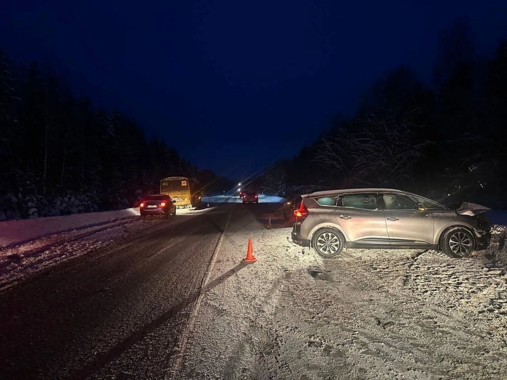 По предварительной информации, женщина, находившаяся за рулём автомобиля «Рено», выезжала из села Первомайское и при выполнении манёвра перестроения не уступила дорогу школьному автобусу. ПАЗ двигался по трассе прямо не менял траекторию движения. В результате транспортные средства столкнули.
