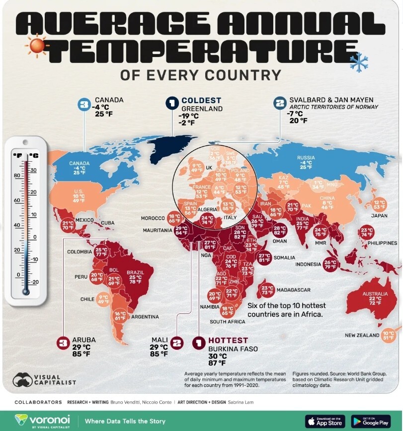 Согласно карте температур, Россия и Канада, со среднегодовой температурой в минус 4 градуса в среднем холоднее даже некоторых островных территорий Антарктики. Причина этому наличие обширных северных территорий. Они сильно влияют на температурный показатель страны. Эксперты подчёркивают, что речь идёт именно о географической средней температуре, а не о климате в местах компактного проживания населения. Например, крупные города России в основном расположены в более умеренных зонах. И там средняя температура может быть выше, чем в целом по стране.