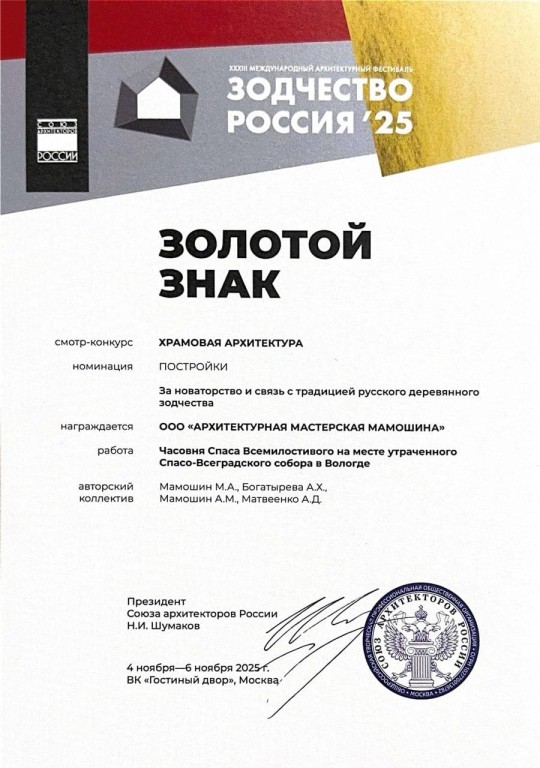 Часовня Спаса Всемилостивого, расположенная на площади Революции города Вологда, была удостоена наивысшей награды престижного Международного архитектурного фестиваля «Зодчество».