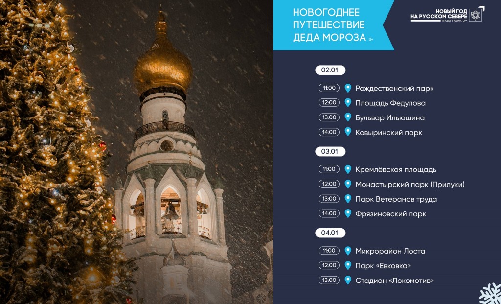 Новогодние праздники приближаются, и с 2 по 4 января Дед Мороз посетит разные микрорайоны Вологды. Горожан ждут праздничные программы, игры и конкурсы.