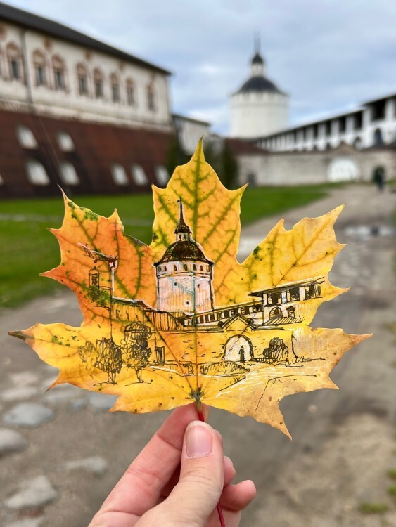 Художница из Череповца изобразила Кирилло-Белозерский монастырь на кленовом листе