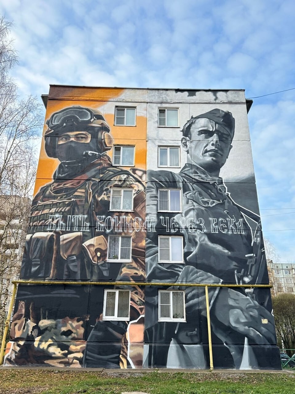 «Мурал на ул. Псковской, 5, посвящён двум поколениям русских солдат. Я специально сделал бойца СВО в цветном варианте, чтобы передать живое, настоящее время, современную боевую амуницию и визуальное отличие современных бойцов от солдат прошлого века. Но все они делают одно дело — защищают Родину. Второй солдат времен Великой Отечественной войны изображен в черно-белых тонах, в советской военной одежде, в пилотке со стареньким автоматом ППШ, как на старых фото. Они оба словно стоят в один и тот же момент, но в разные времена, спиной к спине», — объяснил задумку художник.