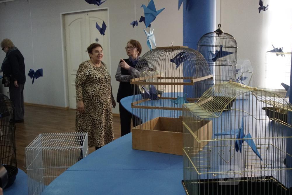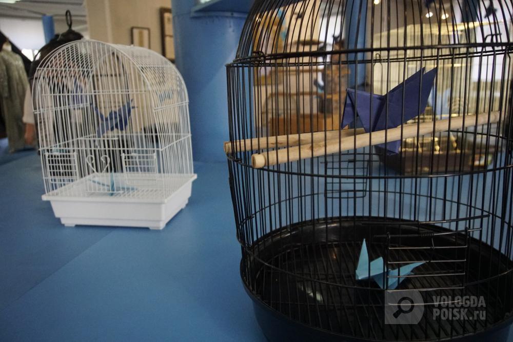 Первыми в глаза бросаются клетки со сложенными из синей бумаги птицами. Оригами взяты из фонда Константина Хабенского, посвящённого борьбе с опухолями головного и спинного мозга.