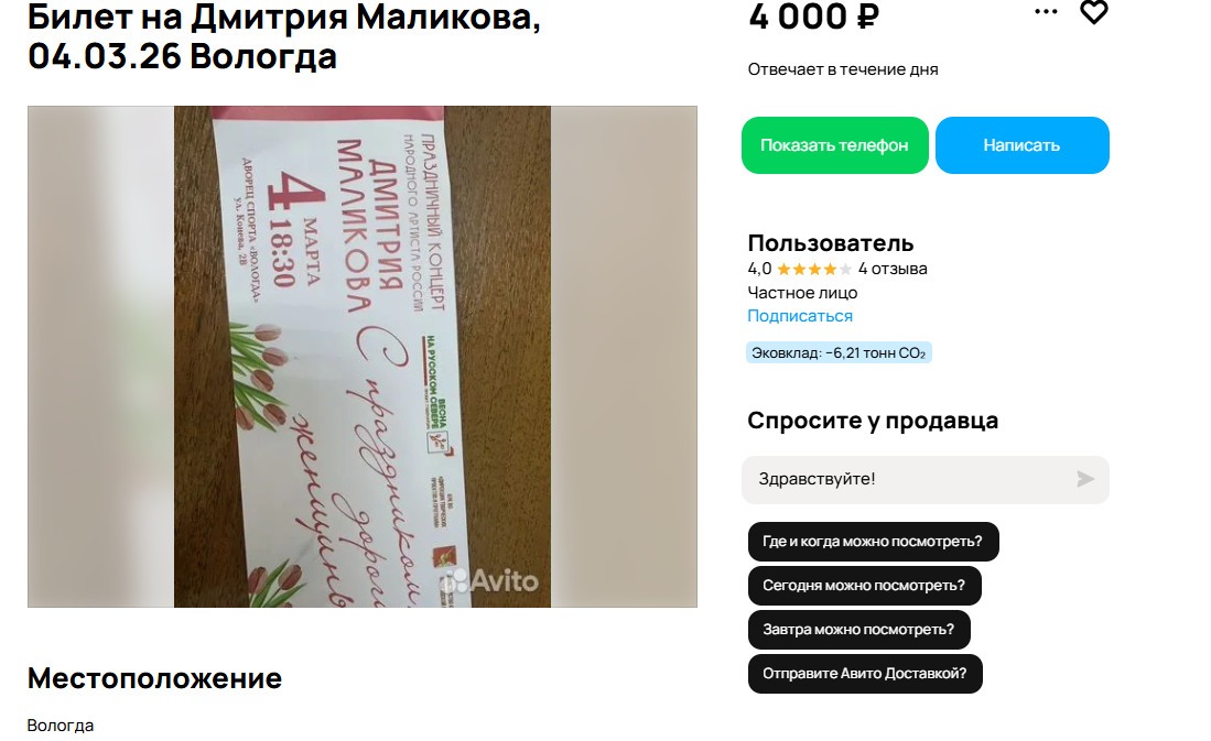 При этом, возможность увидеть эстрадного исполнителя четвёртого марта на сцене всё ещё остаётся у самых преданных его поклонников. На сайте объявлений предприимчивые горожане выложили билеты на концерт Маликова, причём не поскупились отразить в ценнике потраченные на стояние в очереди часы.