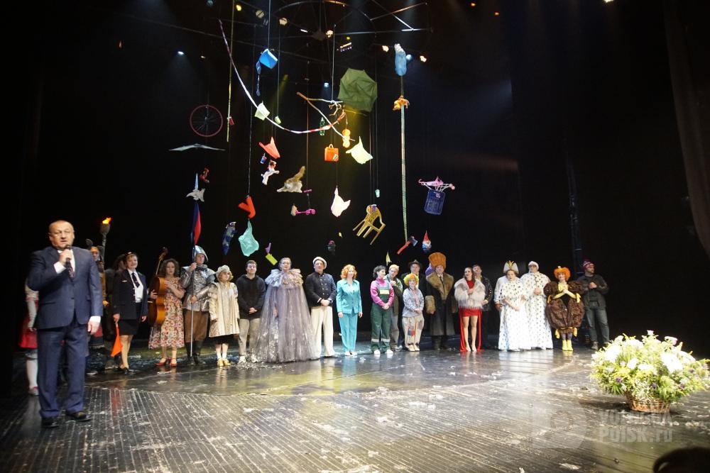 Александр Пудин на фоне пёстрого коллектива поприветствовал сидящего в зале бывшего художественного руководителя театра Бориса Гранатова.