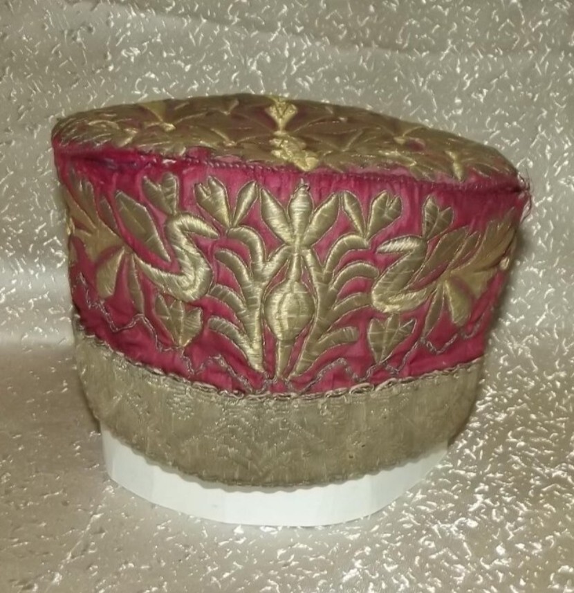 «Этот конкретный экземпляр сшит из бордовой шёлковой камки. Нижний край высокого очелья окаймлён золотистым позументом, а в верхней части нитью вышита композиция: две стилизованные птицы среди растительного узора. На верхушке (донце) вышивка изящной «сканью» также изображает птиц и цветы», - подробно описывают детали специалисты.