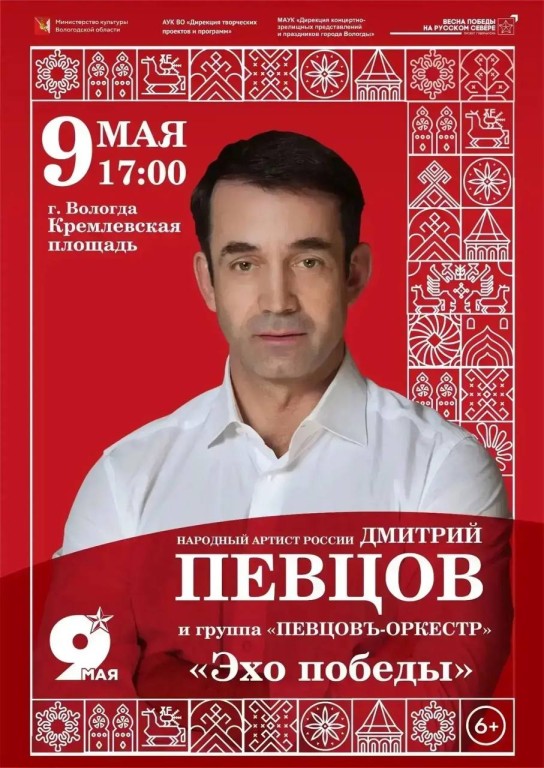 Патриотическая программа «Эхо победы» начнется в Вологде на Кремлевской площади в 17:00. Выступление артиста, которого хорошо знают и любят вологжане, станет одним из центральных событий праздничной программы. Певцов не впервые будет в нашем регионе, ранее мы сообщали о его визитах на Вологодчину.