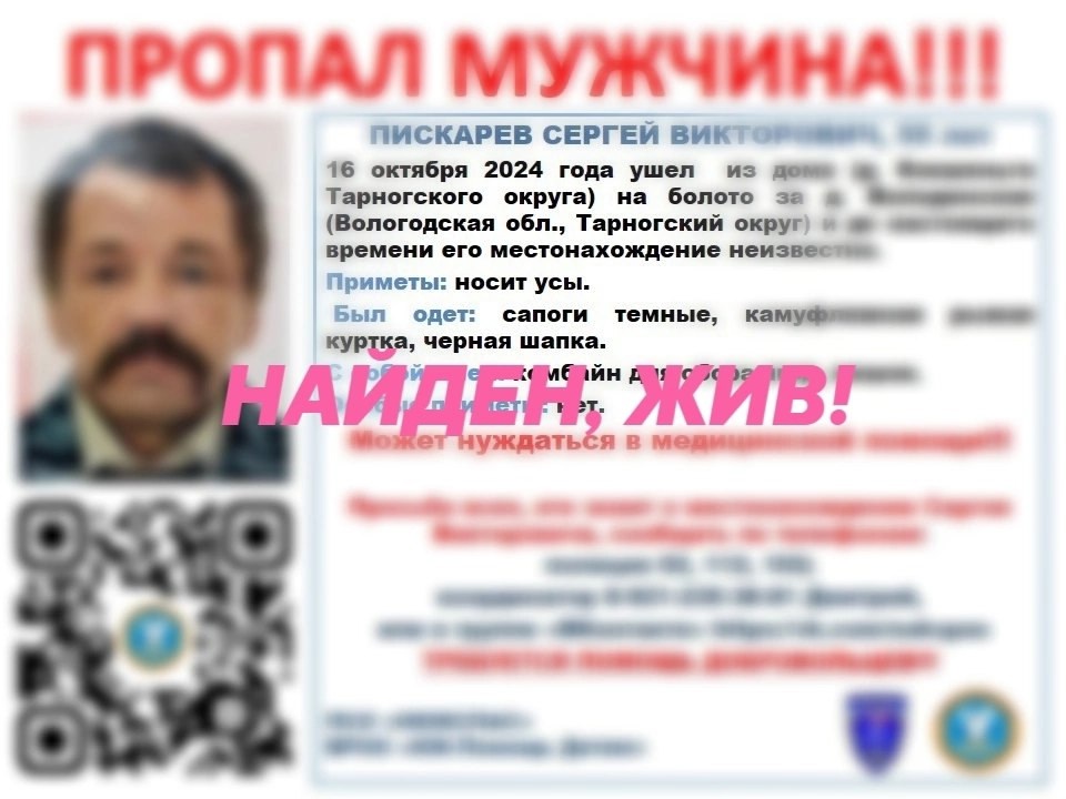 Очень хорошая новость: нашелся пропавший в лесу 55- летний житель Тарногского муниципального округа Сергей Пискарев!