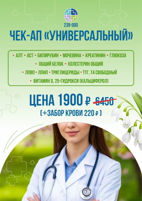 Универсальный подойдет тем, кто хочет проверить общее состояние. В него входят: общий анализ крови, глюкоза, липидограмма (холестерин), креатинин, панкреатическая амилаза, АЛТ, витамин D, ТТГ и Т4 свободный.