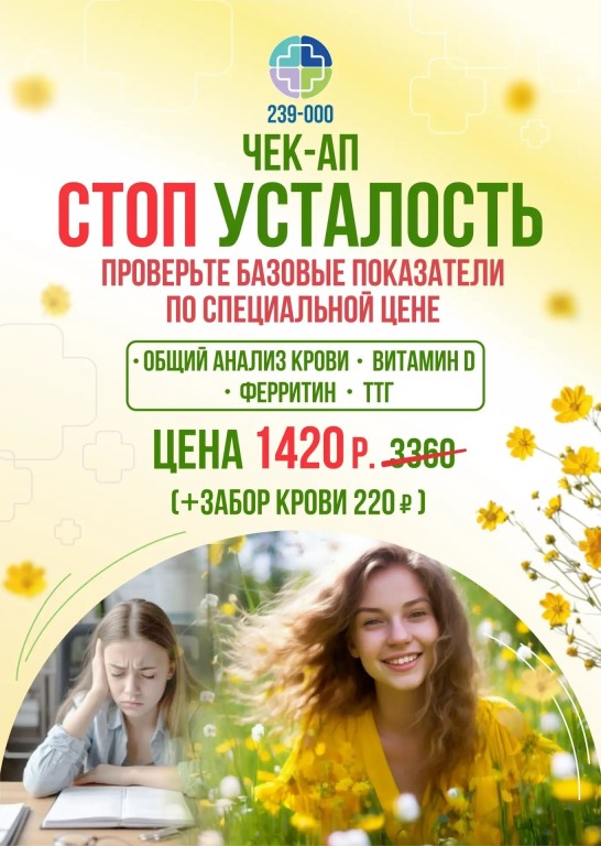 Стоп-усталость создан для тех, кто жалуется на упадок сил, сонливость и снижение работоспособности. В наборе: общий анализ крови, витамин D, ферритин и ТТГ.