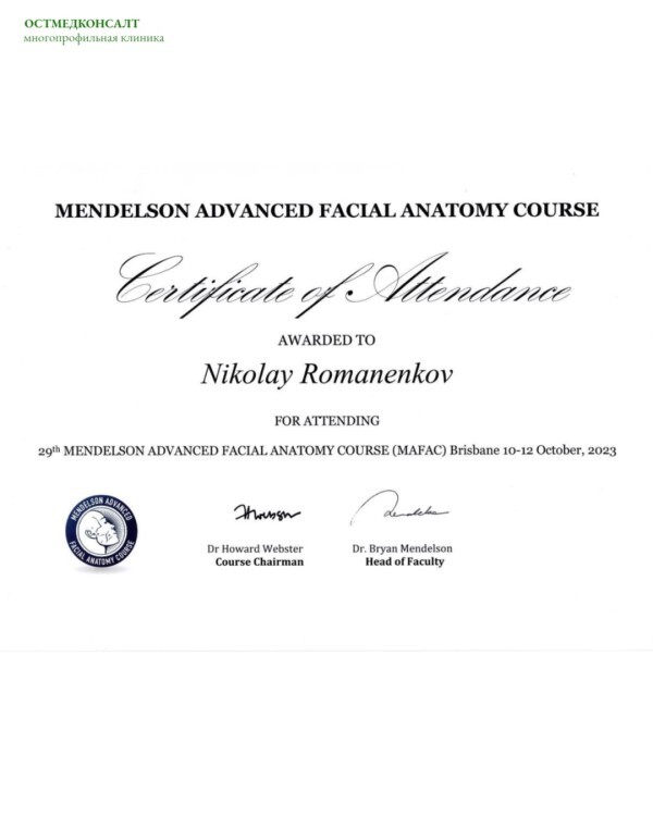 В число 8 хирургов в России, которые владеют методикой спейслифтинга и прошли обучение непосредственно у доктора Мендельсона, входит и врач клиники "ОстМедКонсалт" Николай Романенков.