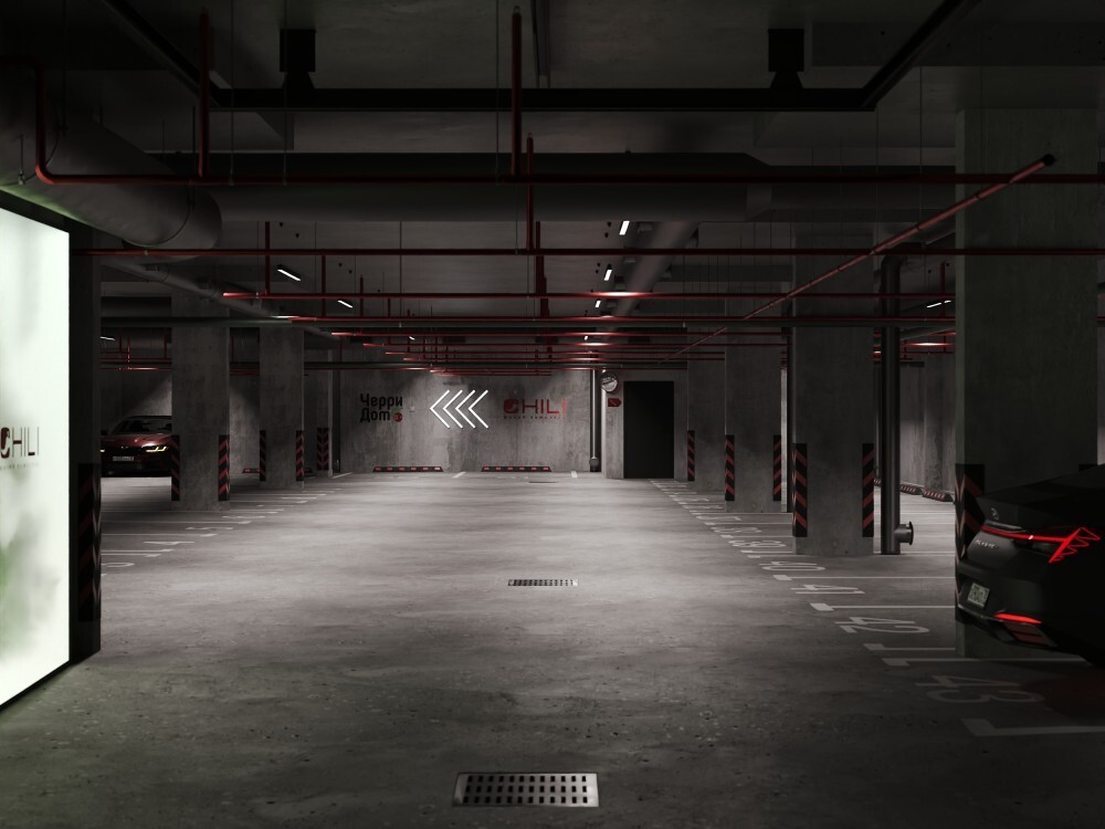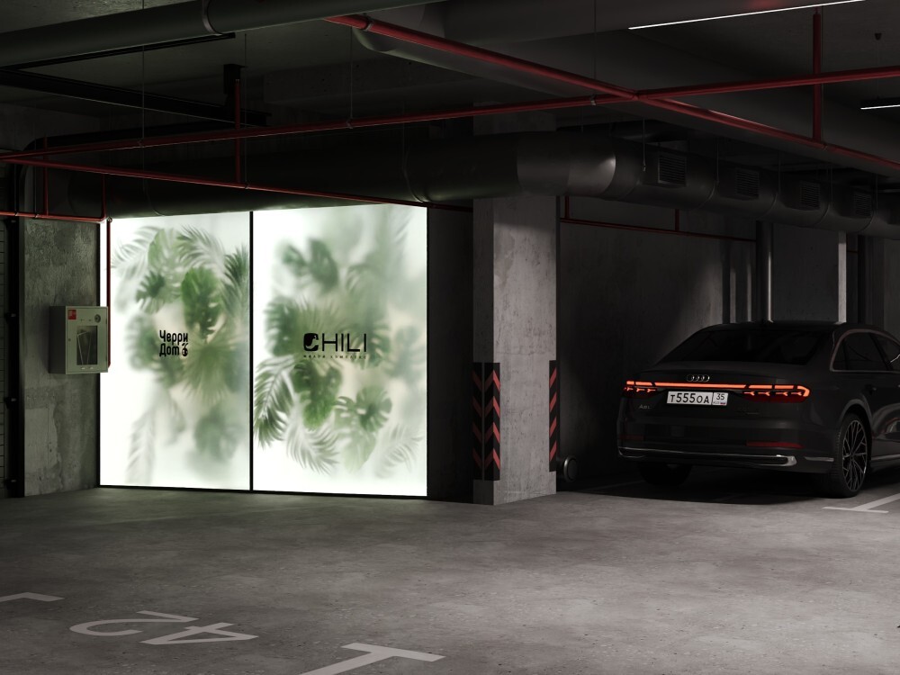 В отличие от стандартных «бетонных коробок», паркинг в «Чили» проектировался студией Cherry Design. Основная идея — избавить жителя от ощущения «невзрачного помещения» сразу после того, как он заглушил двигатель.