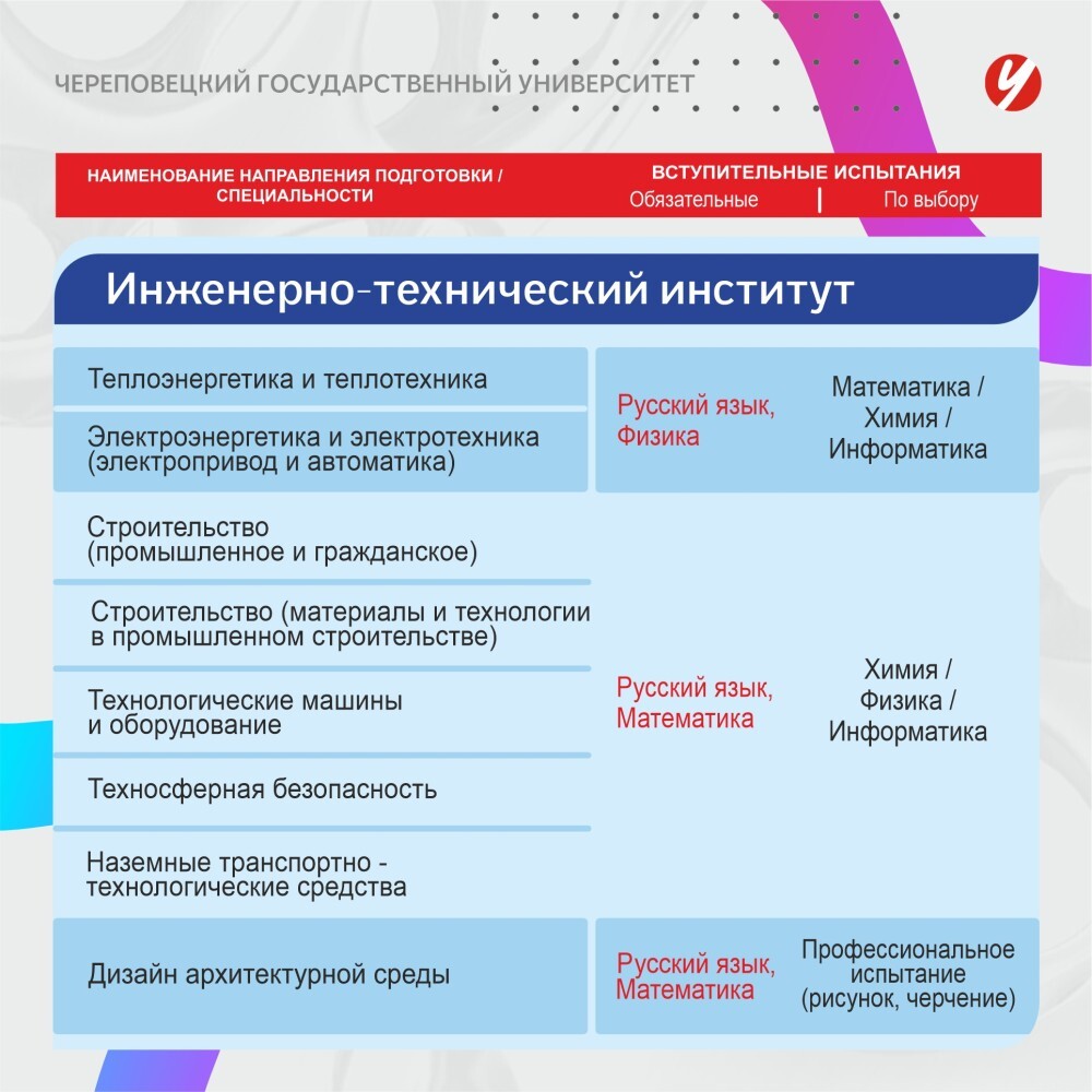 В карточках собрали информацию, какие экзамены нужны для поступления в Череповецкий государственный университет по разным направлениям.