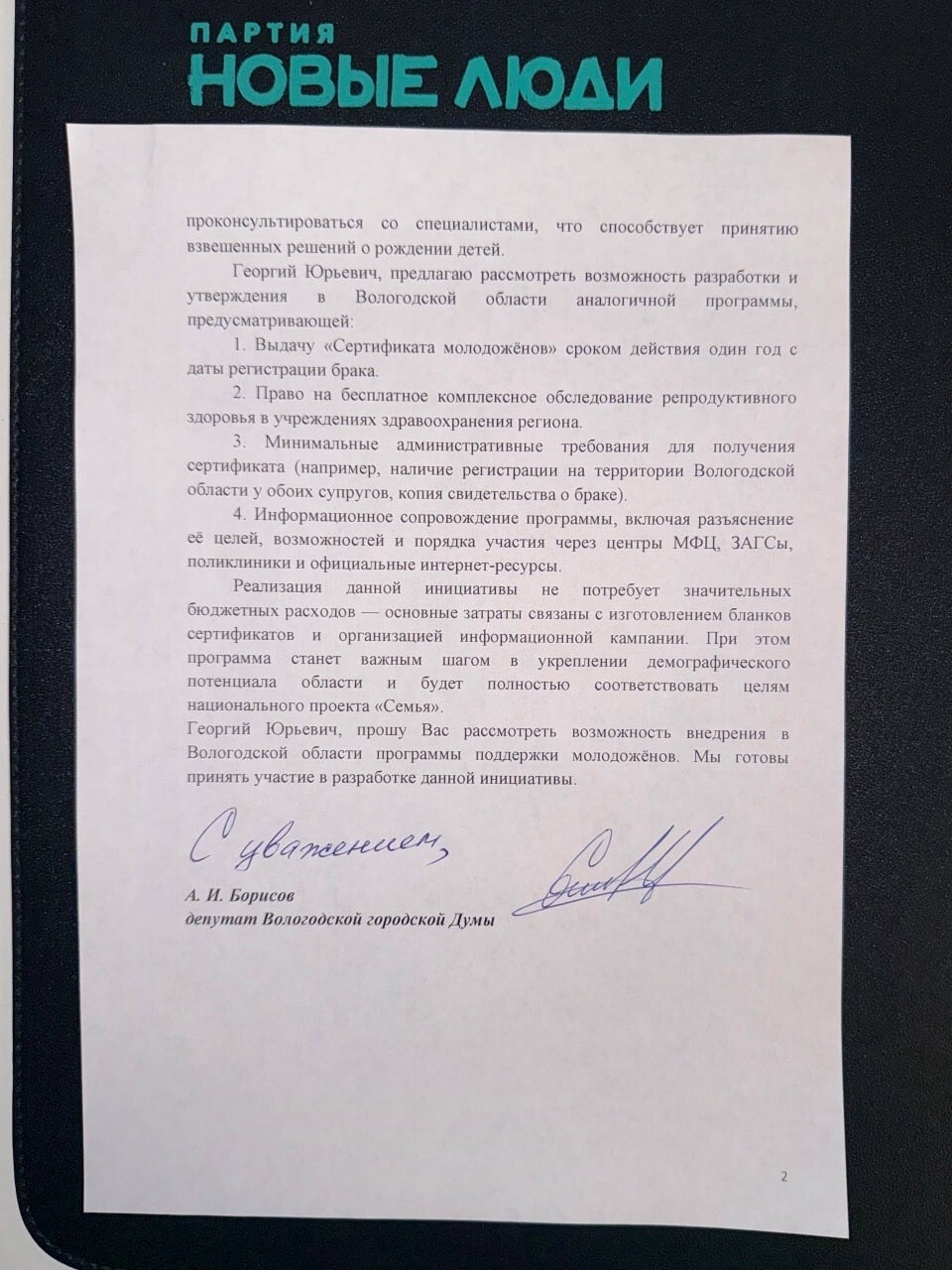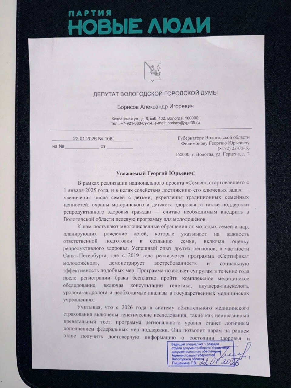 По аналогичной схеме может заработать и Вологодская область. Соответствующее предложение лидер партии «Новые люди» на Вологодчине и депутат Вологодской городской Думы уже направил губернатору региона Георгию Филимонову. Внедрение сертификатов на комплексное обследование для новобрачных стало бы логичным и важным дополнением к действующим мерам демографической поддержки.