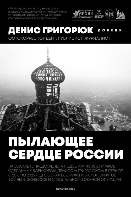 Сегодня Государственный архив Вологодской области при поддержке регионального отделения Российского исторического общества и ассоциации «Эхолот» представляет фотовыставку «Пылающее сердце России». Автор работ — известный донецкий военный корреспондент Денис Григорюк.