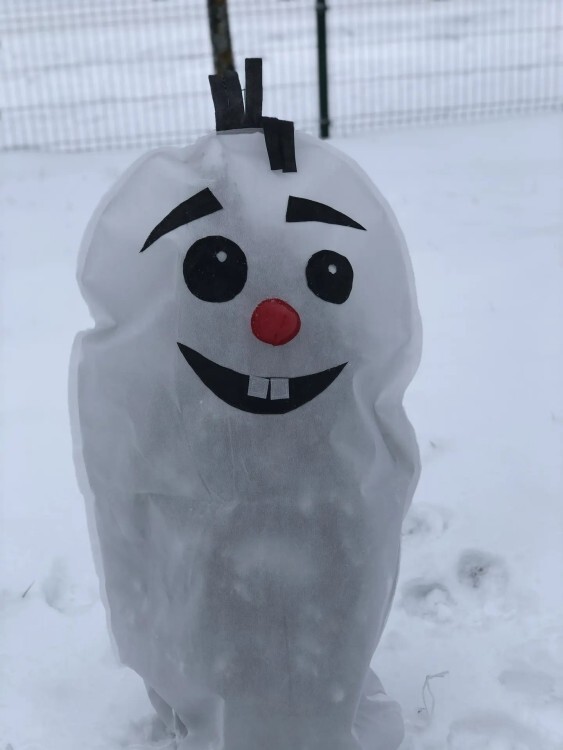 В рамках проекта «Школьный двор — моя страна» девочки взяли шефство над туями, но вместо стандартных укрытий сшили для них ярких и забавных снеговиков.