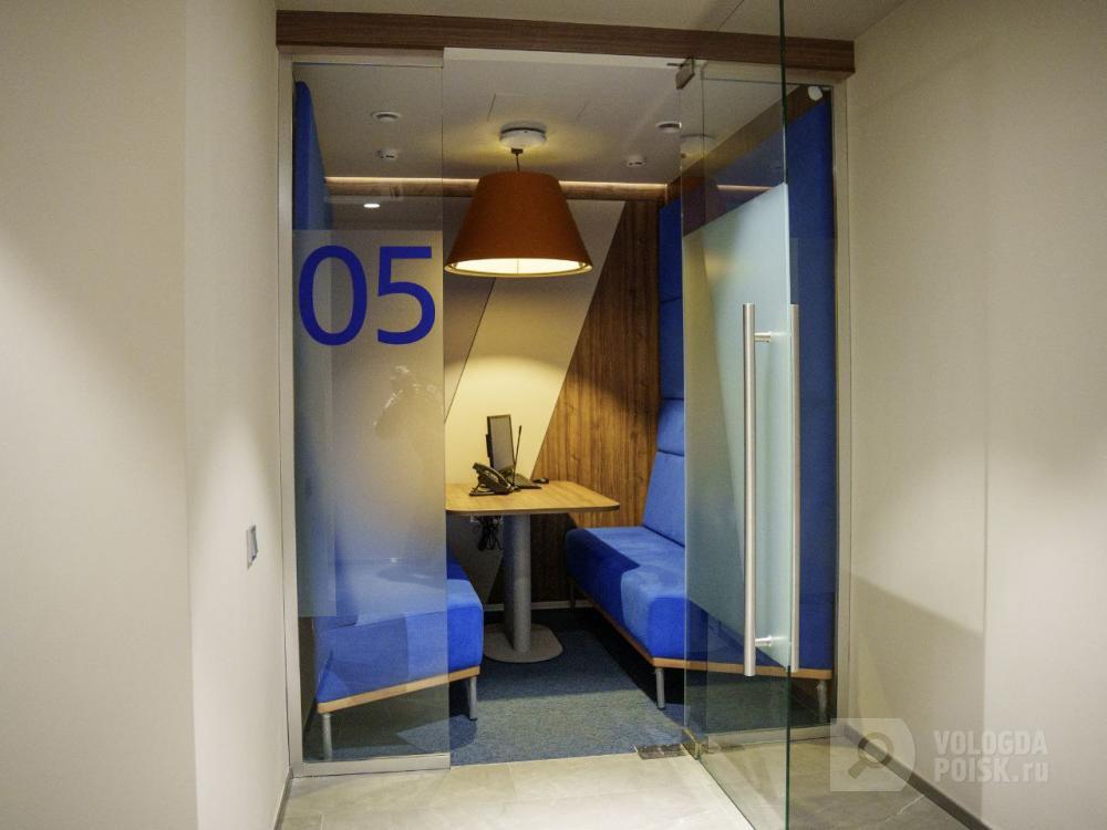 Внутри помещение офиса оборудовано с учетом современных стандартов обслуживания: клиентов и сотрудников больше не разделяет стойка – прием посетителей ведется в комфортных зонах с мягкой мебелью. В офисе есть специальная переговорная комната, где клиенты могут сдать биометрические данные.