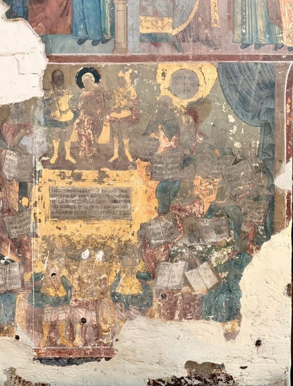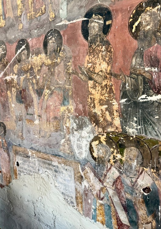 Во время обследования реставраторы обнаружили многочисленные повреждения, включая следы поздних вмешательств и участки, полностью перекрытые более поздними слоями живописи. Особое внимание привлекли повреждения, похожие на пулевые пробоины. Подтверждением этой версии стала найденная металлическая пуля, расположенная рядом с изображением Христа в сцене «Тайная вечеря» на южной стене храма.
