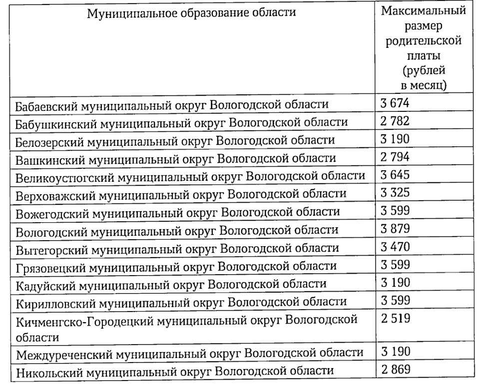 Самый высокий предельный порог традиционно зафиксирован в Череповце — 5753 рубля в месяц. В Вологде и Великом Устюге родители будут платить не более 3645 рублей. В Вологодском округе максимальная плата составила 3879 рублей, в Усть-Кубенском округе —3734 рубля, в Бабаевском округе — 3674 рубля.