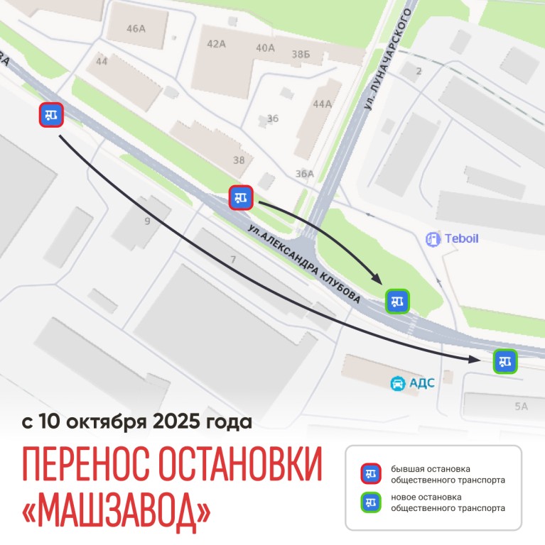 Второе изменение запланировано на 10 октября и затронет остановку «Машзавод». Для удобства пассажиров, пользующихся пригородными маршрутами, будет проведена оптимизация транспортной инфраструктуры: автобусы маршрутов №403, 405, 406, 408, 412 будут осуществлять посадку и высадку пассажиров на новой остановке возле автозаправочной станции; две близлежащие остановки объединяются в одну.