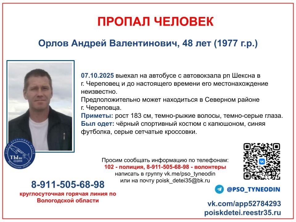 48-летний Андрей Валентинович Орлов пропал еще 7 октября при загадочных обстоятельствах. По имеющимся данным, в этот день он сел на автобус в поселке Шексна, который отправлялся на Череповец. С тех пор о мужчине ничего неизвестно.