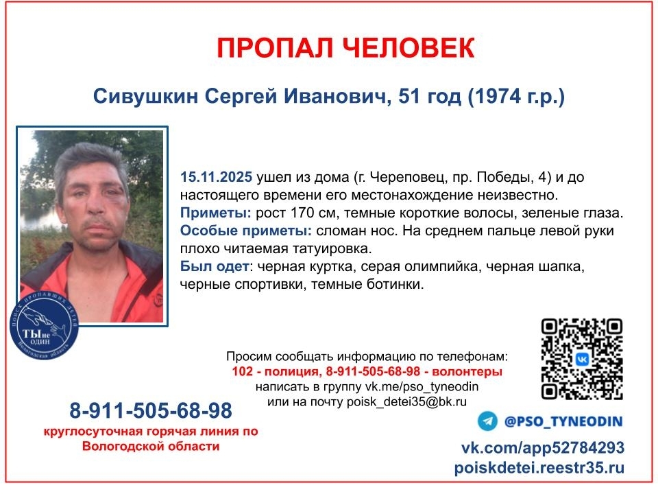 51-летний Сергей Иванович Сивушкин ушел из дома по проспекту Победы, 4, в Череповце еще два месяца назад. Близкие видели его в последний раз 15 ноября. С тех пор связи с ним нет, где мужчина находится сейчас, неизвестно.