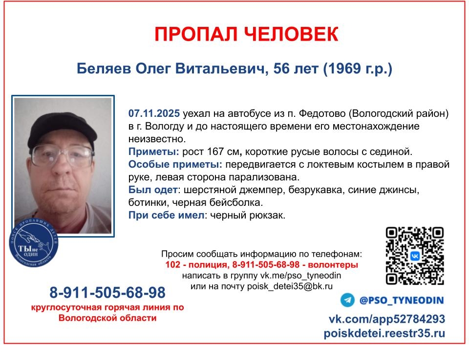 56-летний Олег Витальевич Беляев 7 ноября сел в автобус в поселке Федотово, чтобы отправиться в Вологду. И с тех пор неизвестно, где он находится.