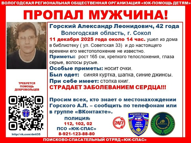 11 декабря житель Сокола, 42-летний Александр Леонидович Горский примерно в два часа ушел из дома по ул. Советская, 33.
