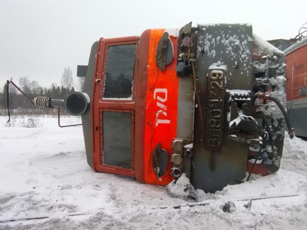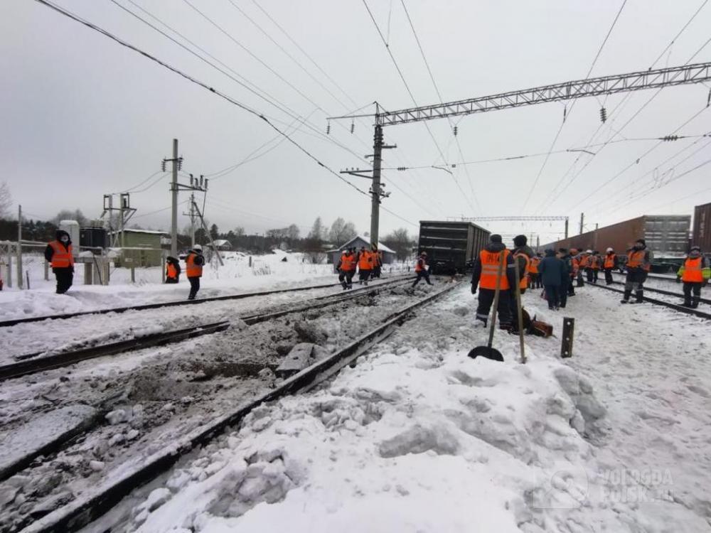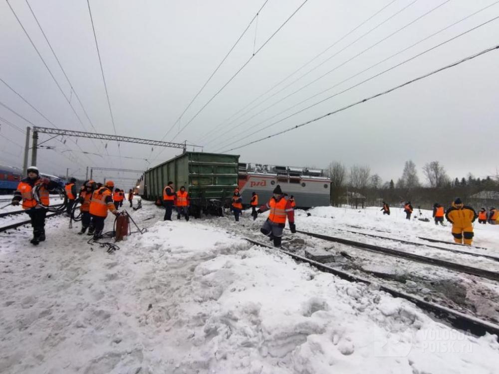 Появились подробности и новые фото с места опрокидывания вагонов товарного поезда под Вологдой