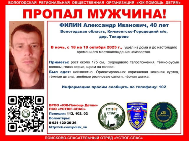 В ночь с 18 на 19 октября 40-летний Александр Иванович Филин, проживающий в деревне Токарево Кичменско-Городецкого округа, ушел из дома, и с тех пор близкие люди потеряли с ним связь.