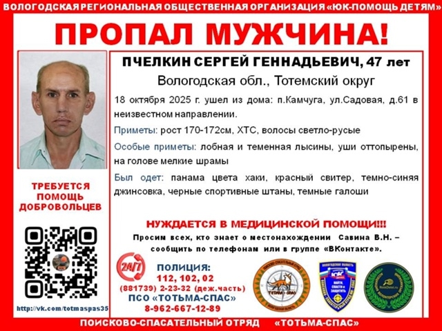 Житель Тотемского округа, 47-летний Сергей Геннадьевич Пчелкин 18 октября ушел из дома в поселке Камчуга, ул. Садовая, 61, неизвестно куда. Близкие не знают, где мужчина сейчас находится.