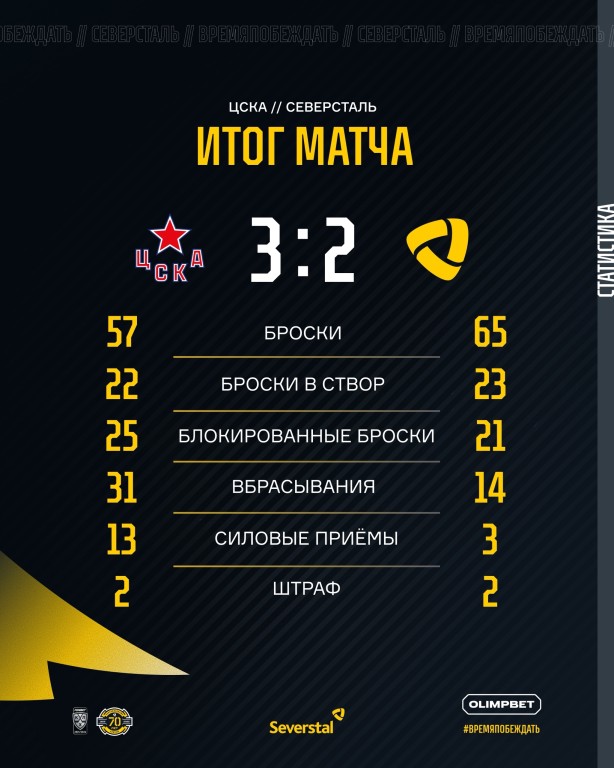 Матч ЦСКА - «Северсталь» завершился со счетом 3:2 (1:1, 2:0, 0:1).