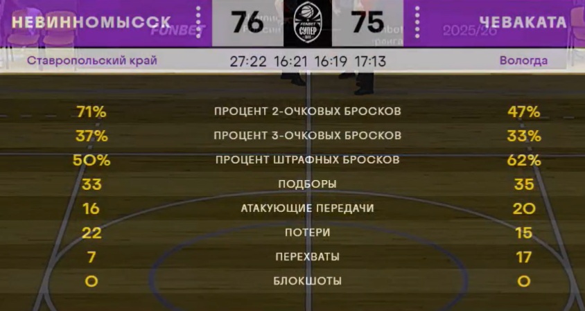 Матч «Невинномысск» - «Чеваката» завершился со счетом – 76:75 (27:22, 16:21, 16:19, 17:13).