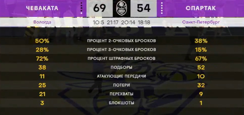 Сегодня в Вологде на паркете одноименного спорткомплекса в рамках регулярного чемпионата России по баскетболу среди женских команд Суперлиги сезона-2025/26 состоялся матч «Чеваката» - «Спартак» (Санкт-Петербург).