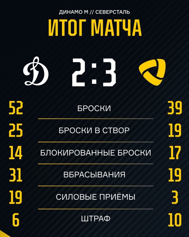 Взглянув в очередной раз на цифры статистики, можно назвать этот матч парадоксальным. В первом тайме доминировали череповчане и проиграли 0:2, во втором все показатели за москвичей, а на табло уже 2:2: броски – 22/14, в створ – 10/8, блокированные – 4/8, отборы – 1/0, потери – 3/5, перехваты – 2/0, время в атаке – 07:21/03:38.