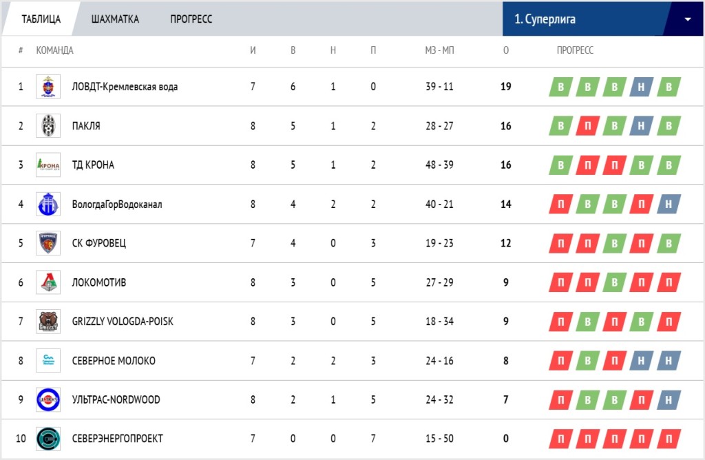 Открывали тур команды «Ультрас-Nordwood» и «ВологдаГорВодоканал». Внимательные болельщики, наверняка, заметили, что новички Суперлиги скорректировали свое название, добавив в него наименование своего партнера. В моменте это, как будто, сделало «ультрасов» сильнее. «Коммунальщики» и по опыту, и по местоположению в турнирной таблице считались фаворитом этого противостояния, но оно завершилось вничью. Сенсация? Время покажет, как говорится, будем посмотреть.