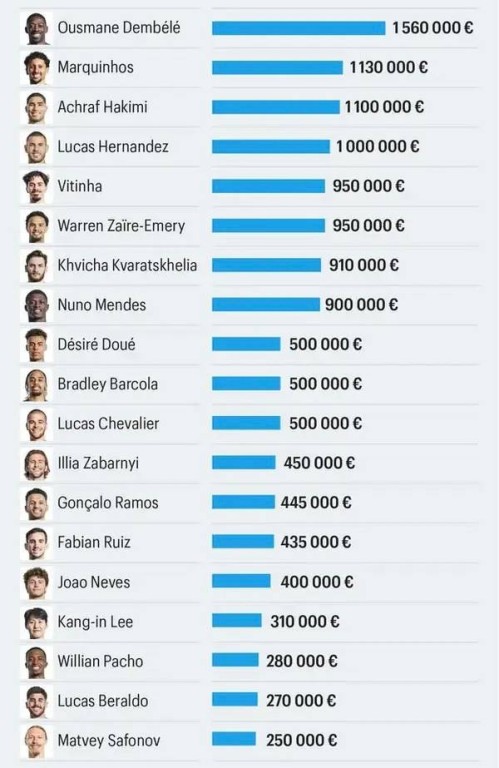 Накануне французское издание La Parisien опубликовало зарплаты футболистов «Пари Сен-Жермен». Самый большой оклад у действующего обладателя Золотого мяча, 28-летнего форварда Усмана Дембеле – 1,56 млн евро в месяц (144 млн рублей) до вычета налогов. Замыкают «тройку» самых высокооплачиваемых «парижан» бразильский капитан ПСЖ Маркиньос (1,13 млн евро) и марокканец Ашраф Хакими (один млн евро в месяц).
